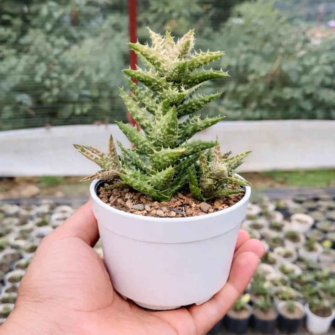 Aloe juvenna, commonly known as Tiger Tooth Aloe, is a striking succulent native to Kenya. This plant features rosette formations of thick, green leaves adorned with white spots and serrated edges that resemble a tiger's teeth. Typically growing up to 12 inches tall, it thrives in bright, indirect sunlight and requires well-draining soil. Watering should follow the "soak and dry" method, allowing the soil to dry out completely between waterings. In summer, it may produce vibrant red flowers on long stems. Low-maintenance and drought-tolerant, Tiger Tooth Aloe is perfect for both indoor and outdoor gardens.